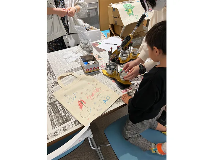 ワークショップではスタンプやペンを使ったオリジナルのエコバッグ作りと、山科の魅力や特徴が描かれた缶バッジ作りを実施し、エシカル消費と山科・醍醐地域の魅力を伝えました。